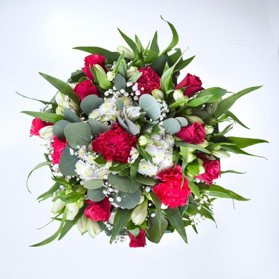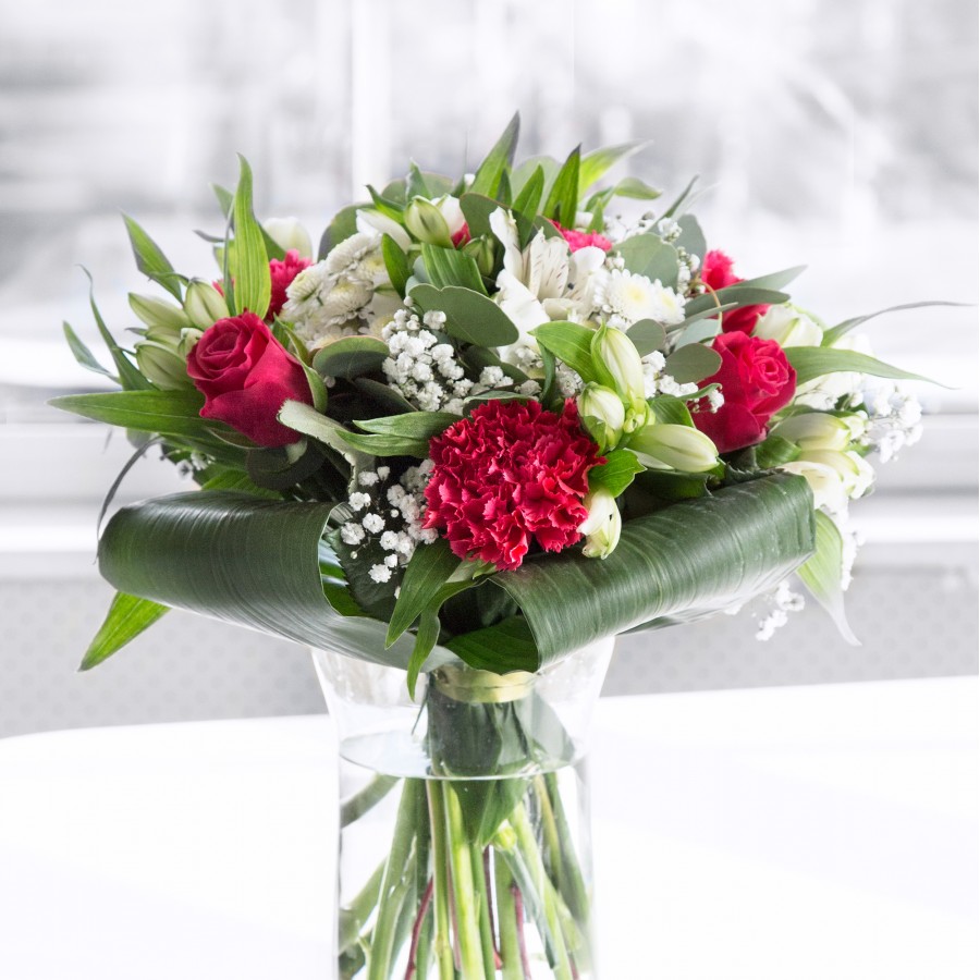 Delight in the elegance of our chic bouquet, showcasing red roses and white chrysanthemums paired with delicate gypsophila. The sophisticated design is completed with white alstroemeria and aspidistra leaves, offering a visually appealing arrangement.