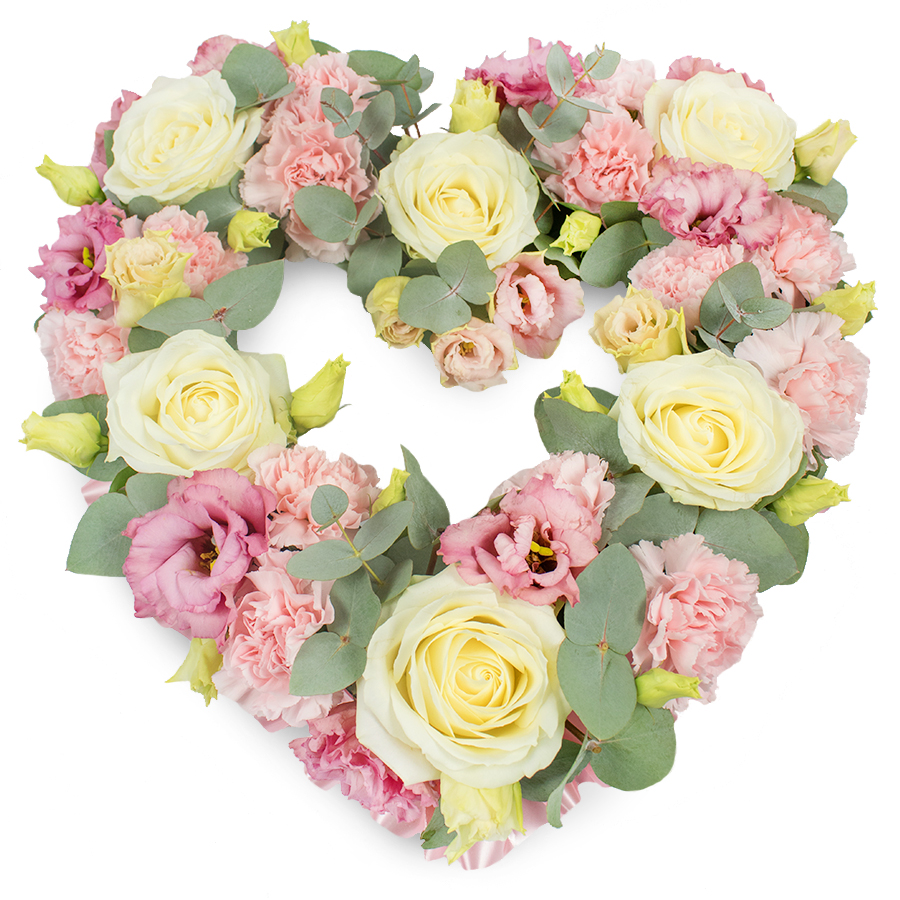 Express your heartfelt sympathy with our Elegant Heart Tribute Bouquet, a stunning arrangement designed to convey love and remembrance. This unique bouquet features a harmonious blend of pure white roses, soft pink carnations, and delicate pink lisianthus, accented by lush eucalyptus leaves.